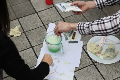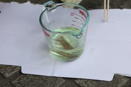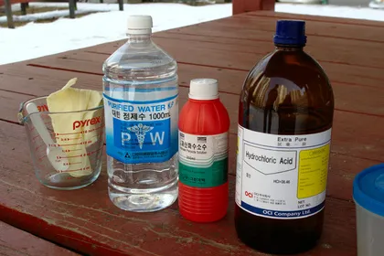 바람을 등지시고, 반드시 과산화수소에 염산을 섞어야 하고, 염산은 천천히 섞습니다. 위 사진은 나쁜 예로, 천천히 섞기 위해서 빨대같은걸 이용해 염산을 흘려 섞으시는게 좋습니다. 화학시간에 유리막대를 사용했던 것 처럼요.