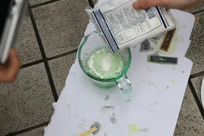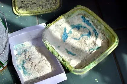 위에 안 섞인 베이킹 파우더를 부어 걷어 내 보니 두번째 부은 부분은 청록색으로 변해 있었습니다.