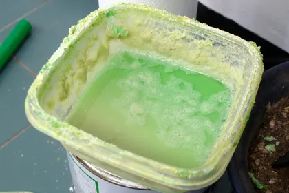 한동안 놔 두니 거품이 가라앉았습니다. 그 상태로 2주(2주가 걸리는게 아니라 다른일에 바뻐서 방치)를 두었더니 위의 상태가 되었어요. 밑에 침전된 층이 있긴한데 위에 액체가 남아 있는걸 보면 아무래도 베이킹 파우더를 덜 부은 것 같아서 한 봉 더 땃습니다. +300원 🙂