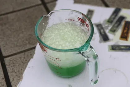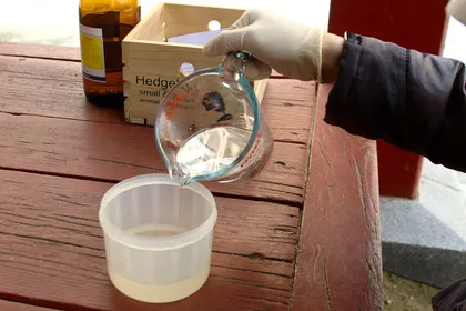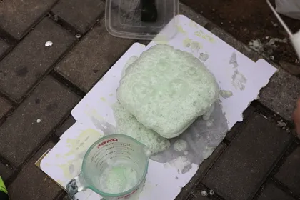 바람을 등지시고, 반드시 과산화수소에 염산을 섞어야 하고, 염산은 천천히 섞습니다. 위 사진은 나쁜 예로, 천천히 섞기 위해서 빨대같은걸 이용해 염산을 흘려 섞으시는게 좋습니다. 화학시간에 유리막대를 사용했던 것 처럼요.