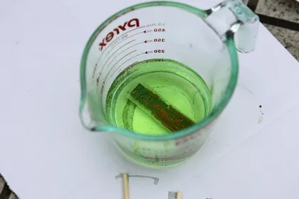 계속 쓰다보면 검은색으로 변하고, 이 때 과산화 수소를 조금 더 넣어주면 다시 색깔이 녹색으로 돌아와서 무한대로 쓸 수 있다고 합니다. 이렇게 구리가 녹아 있는 상태가 염화제2구리 용액이 된 상태인데… 일단 그렇게 까지는 안 써본고로 기회가 되면 다음에 설명을 올리도록 하죠.