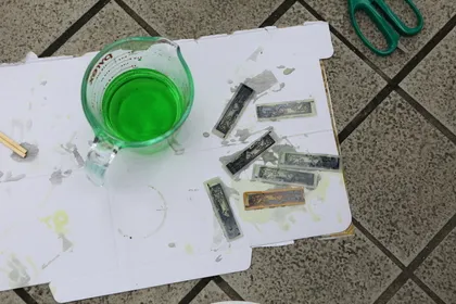 연두색 덩어리 들이 1차 침전물?이고 청록색 가루들이 2차 침전물 에칭을 더 진행해서 용액이 검어 졌었다면 색깔이 이것과는 다르게 될 것 같다는 예상을 해 봅니다.