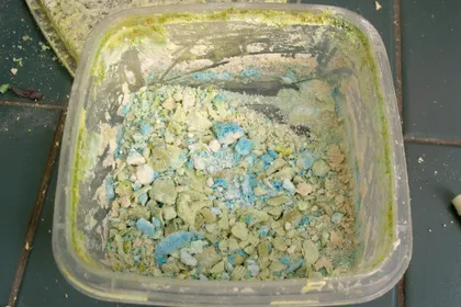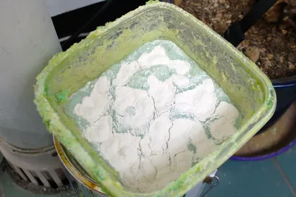 그 밑에 침천되었던 부분은 연두색으로 꽤 딱딱하게 굳어 있네요. 딱딱한 걸로 긁어 보았씁니다.
