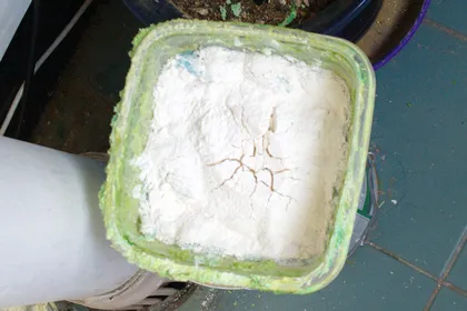 베이킹파우더에요. 150g 한 봉지에 300원으로 집 앞 슈퍼에서 구입했습니다. 부풀어 오르는 특성이 있어서 천천히 섞어야 해요. 참을성 없이 마구 부었더니…