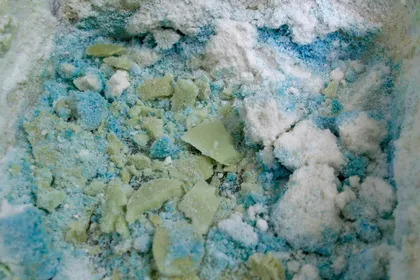 위에 안 섞인 베이킹 파우더를 부어 걷어 내 보니 두번째 부은 부분은 청록색으로 변해 있었습니다.